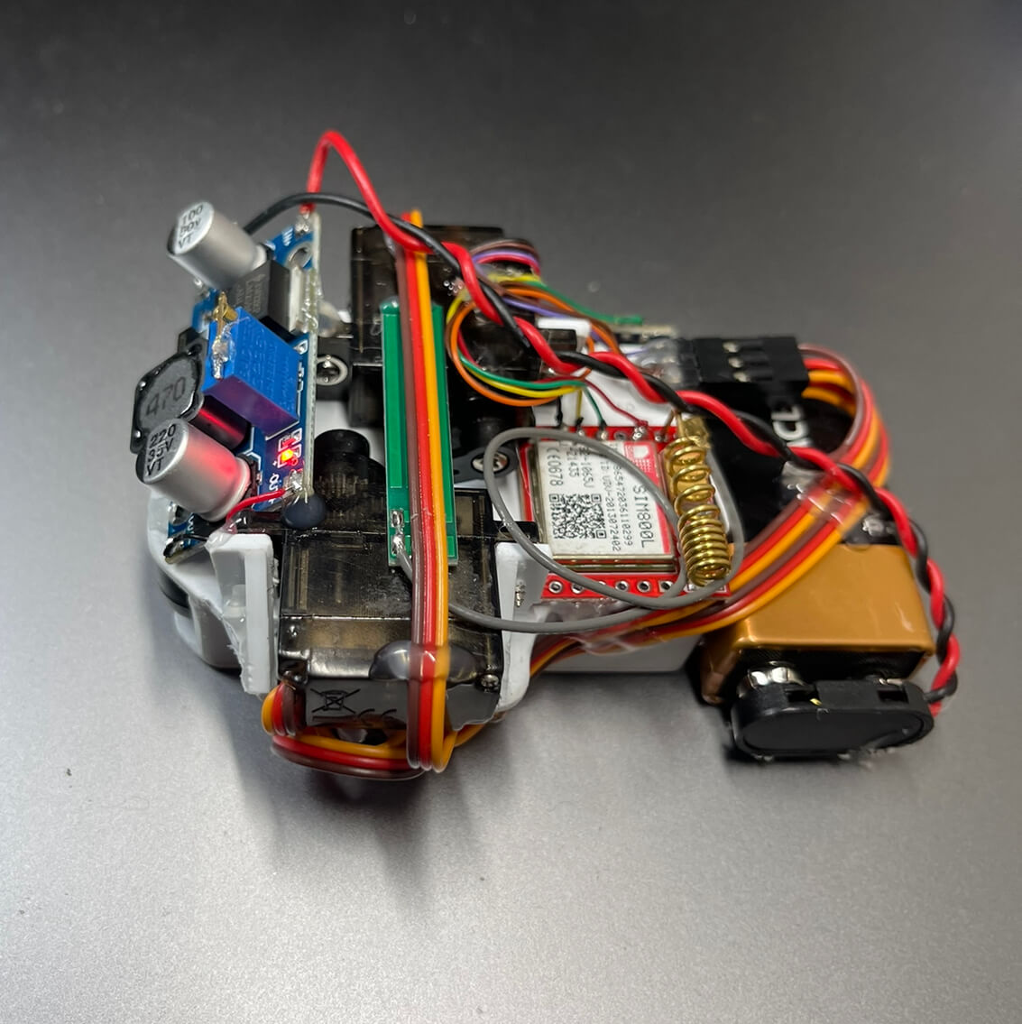 This might be one of my favorite projects i have worked on. using my spare car key i have createde a device that can press the buttons to remote start the car. Using an Arduino nano as a microcontroller and SIM800l for GSM connection by which i only have to send as specific text message and the text is then verified in the microcontroller to then take an action based on the text. I can lock the car and start the car from anywhere in the world with just a text message. I am also using a Step-Down voltage converter for the arduino and the SIM800L module to use 4.5v from the 9V battery. For my next iteration in will get rid of the servos and directly tap into the key's circuit and use a SSR to act as buttons.
