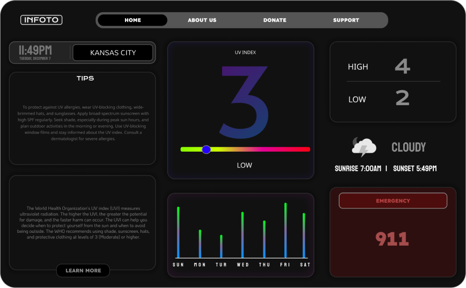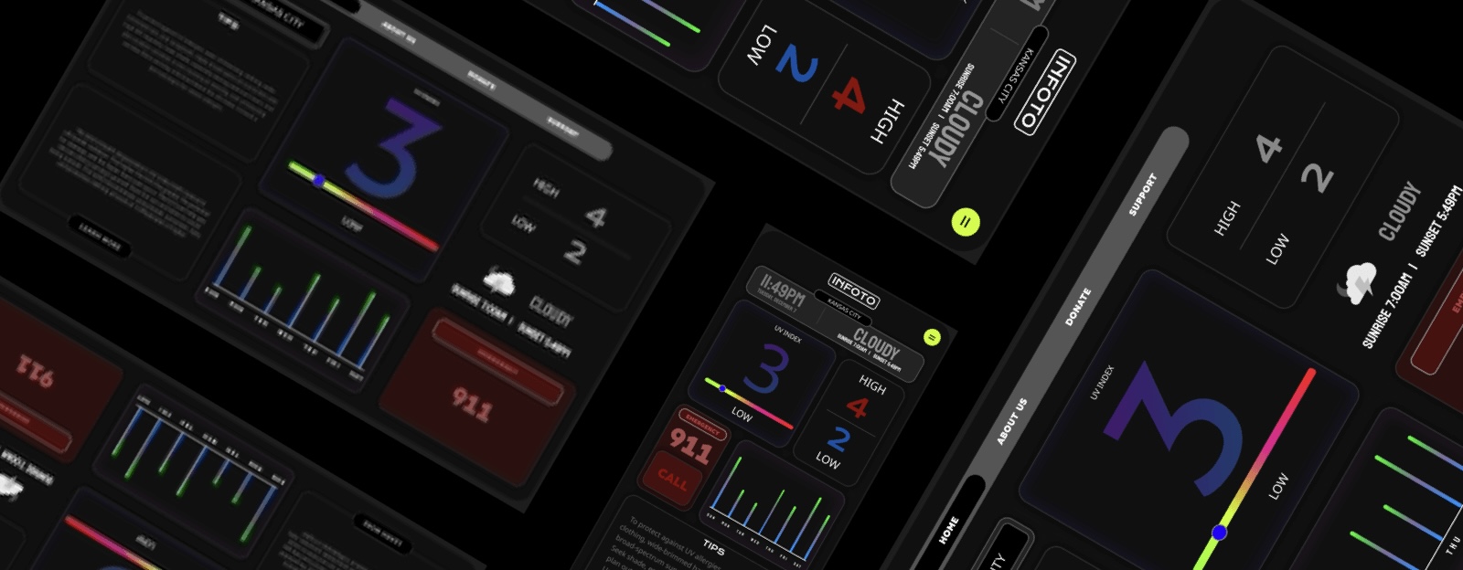 Infoto is a website/app that will enable individuals with sun allergy or photosensitive disability to get all the the related information in one place. The website integrated API to get upto-date UV index based on the user's current location. And based on the location and it's weather the webaite/app will guide the user to navigate throughout their day.
